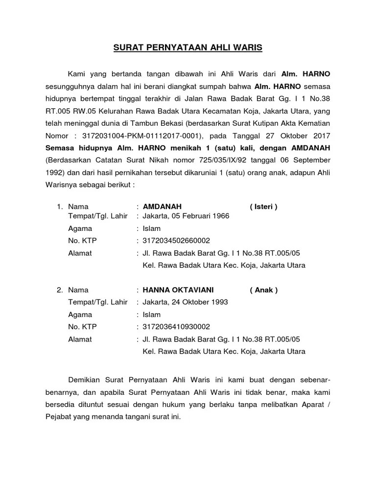 Surat pernyataan ahli waris diatas materai . Persyaratan untuk surat keterangan ahli waris : Surat pernyataan dan keterangan ahli waris. Yang bertanda tangan di bawah ini kami ahli waris dan atau para ahli waris almarhum. Nantinya proses akan dilanjutkan ke tingkat kelurahan dan kecamatan.